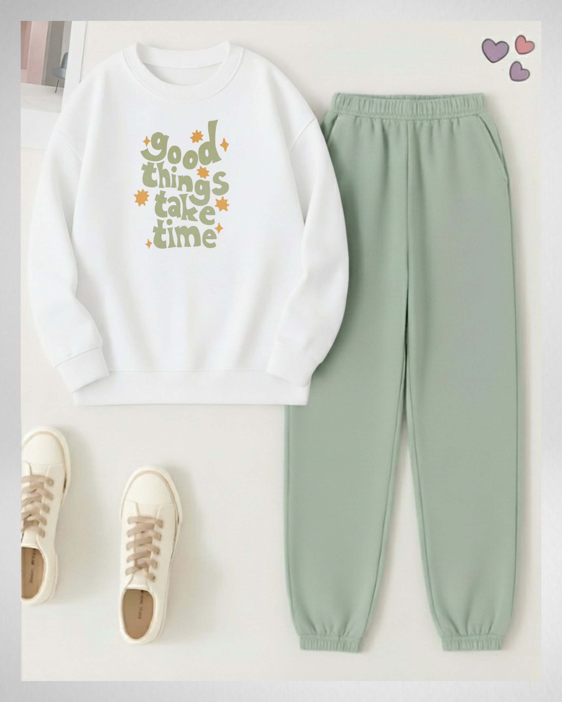- Color: White SweatShirt And Lightgreen Trouser.