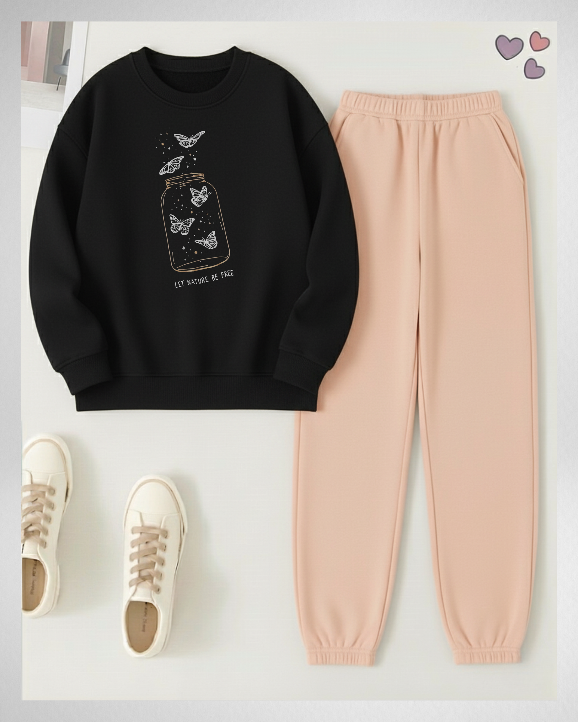 - Color: Black SweatShirt And Peach Trouser.