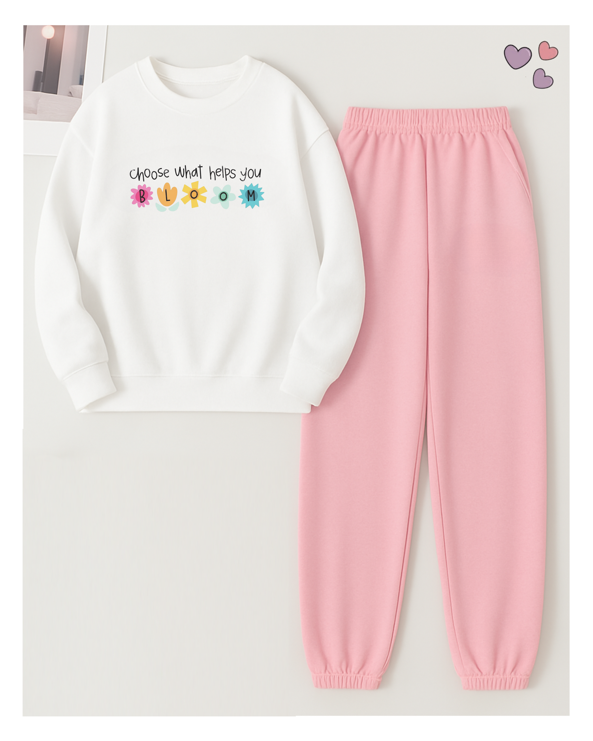 - Color: White SweatShirt And Pink Trouser.