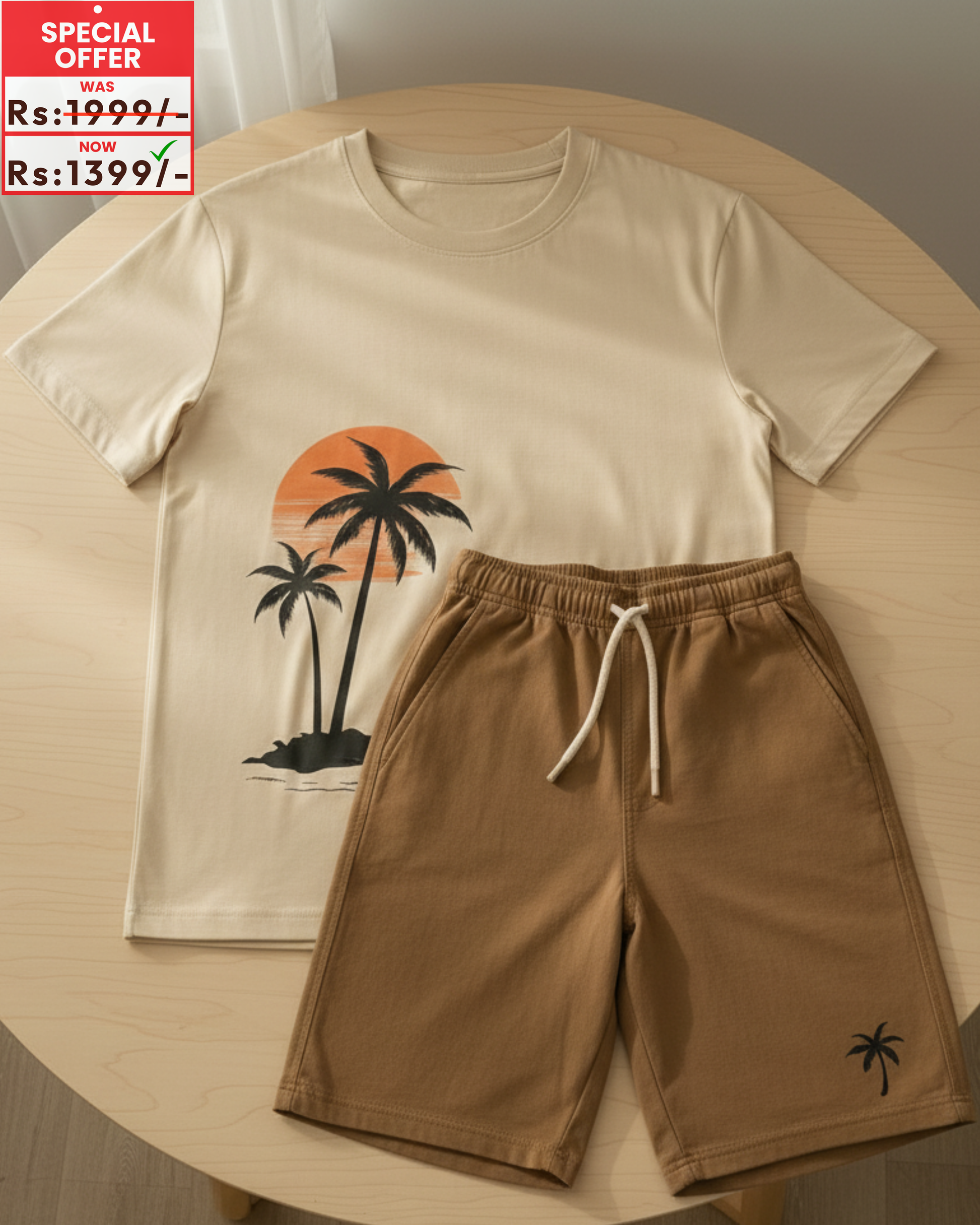 Beat the heat in style with our Summer Co-Ord Set, featuring a lightweight Digital Printed Biege Round Neck T-shirt made from soft single jersey fabric, paired perfectly with comfortable Jersey fabric Brown shorts. Designed to keep you cool and relaxed, this set is your go-to choice for casual summer days, lounging, or quick outdoor plans.