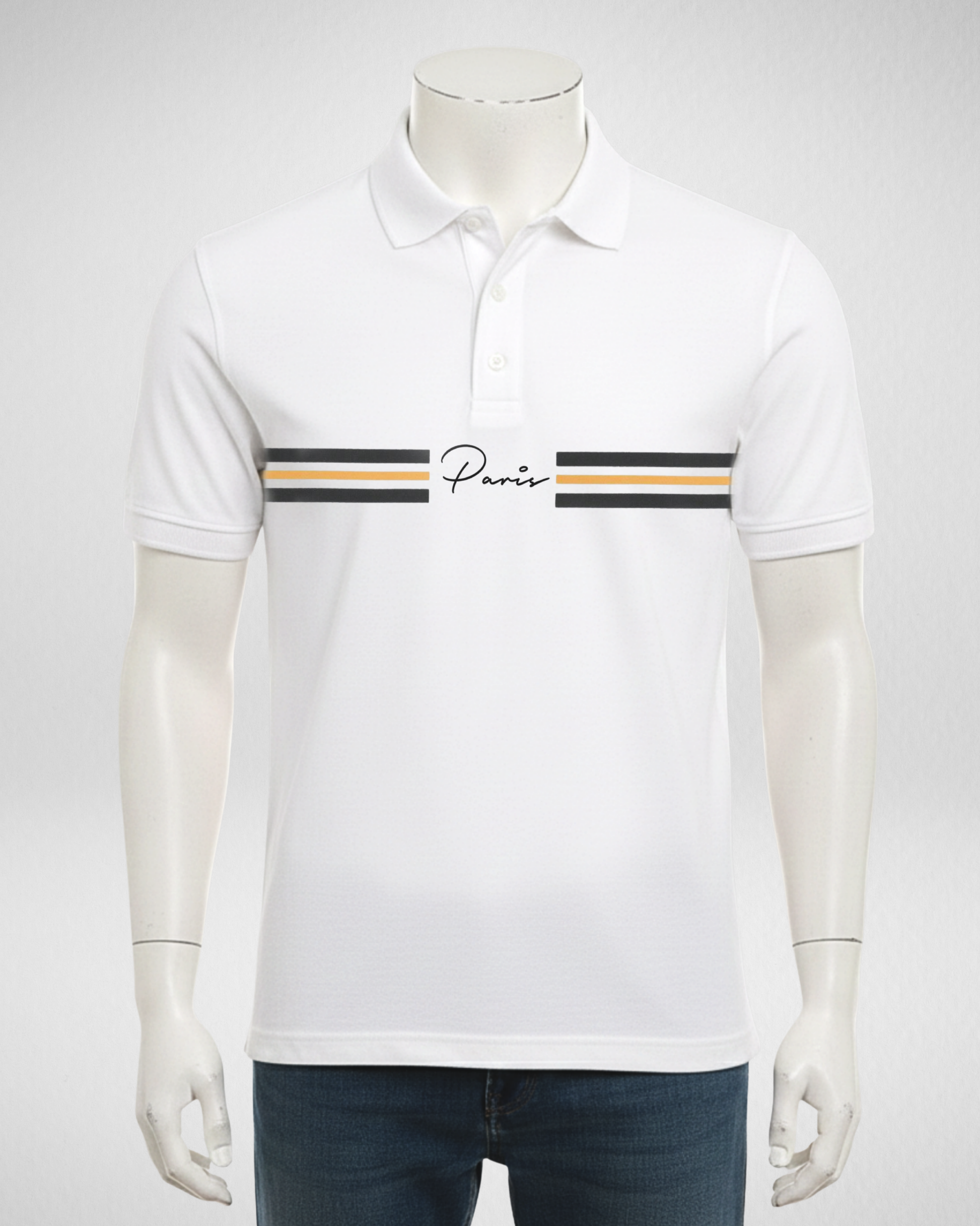White Paris Stripe Printed Polo T-Shirt – Stylish & Comfortable (Code 4577)